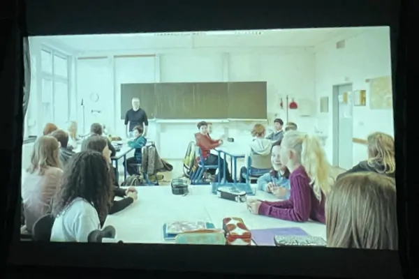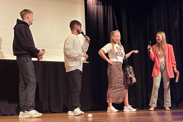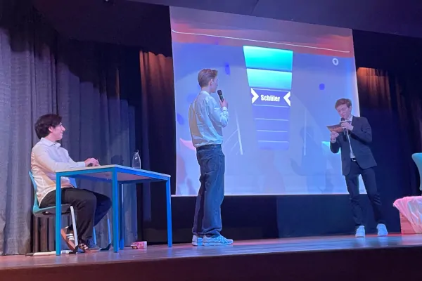 Es folgte eine Videosequenz früher – heute. Engagierte, begeisterte, lebendige Fünftklässler*innen, die gleichen Gesichter sieben Jahre später, die gleichen Situationen – Pause, Unterricht, Hausaufgaben, Klassensprecherwahl – nur diesmal chillig und bemüht cool. Für das Publikum der erste Moment zum Nachdenken. Haben die echt in der fünften Klasse schon die Videos gedreht mit Hinsicht auf das Abitainment? Oder war es für ein anderes Schulprojekt gedacht? Oder gar neu gedreht und mit KI verjüngt? Tatsächlich ersteres. Und das Videomaterial war so für das Programm ein Goldschatz.