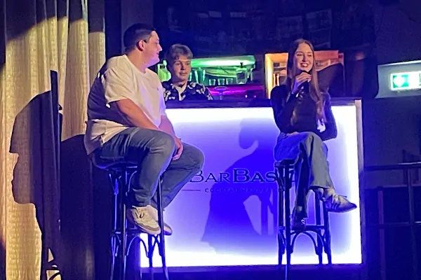 Die Show war bewährt gerahmt: Zwei ehemalige Schüler*innen, Lana und Oli, treffen sich einige Jahre nach dem Abitur in Maxis Cocktailbar und erinnern sich an ihre Schulzeit. Aus diesen Gesprächen heraus, in geselligem Plauderton, entwickelten sich die einzelnen Szenen – mal live auf der Bühne, mal als Video, oft in einem Wechselspiel aus beidem.