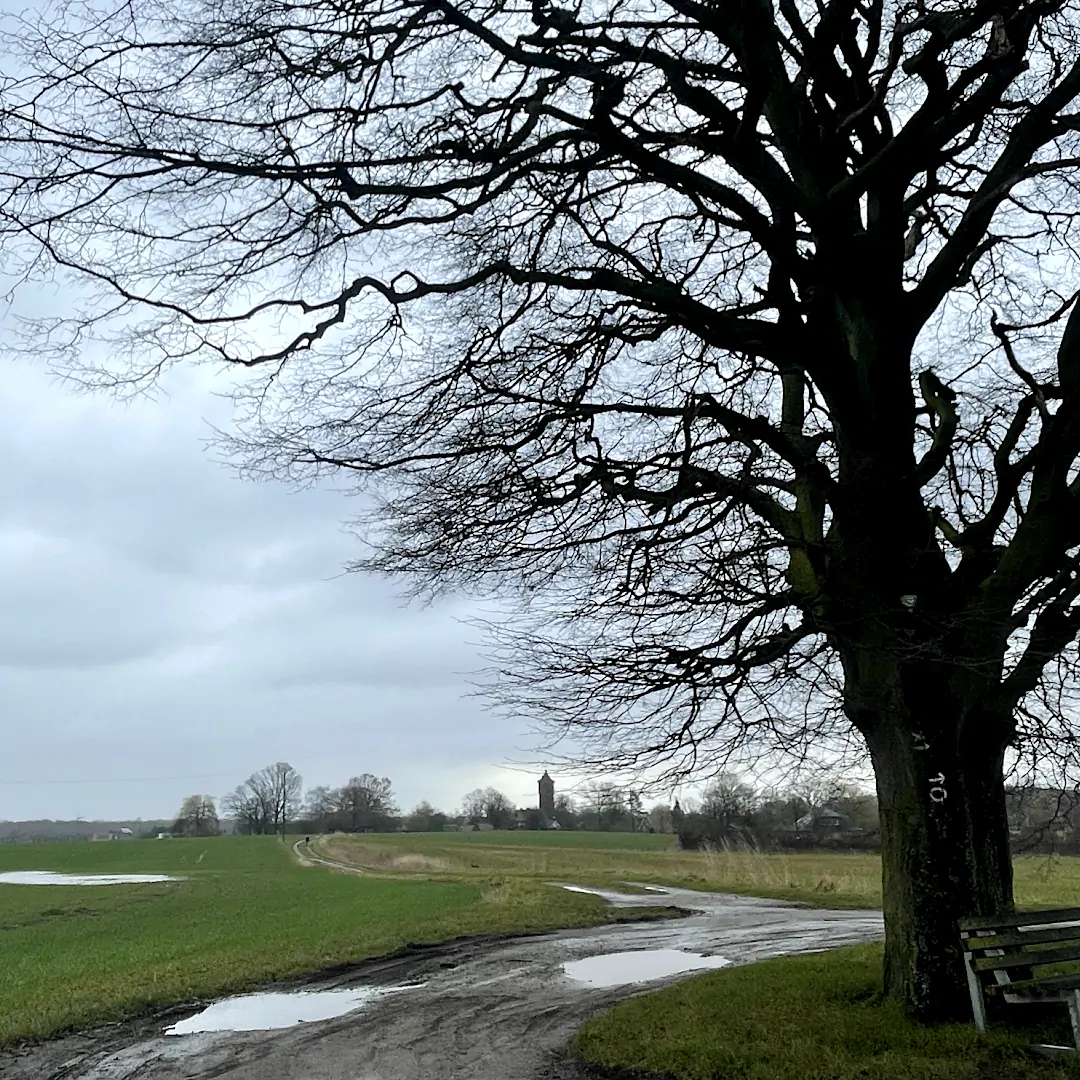 Mächtiger Baum an der Straße Zum Birkenbaum in Cappenberg, Blick über die Felder auf den Wasserturm.